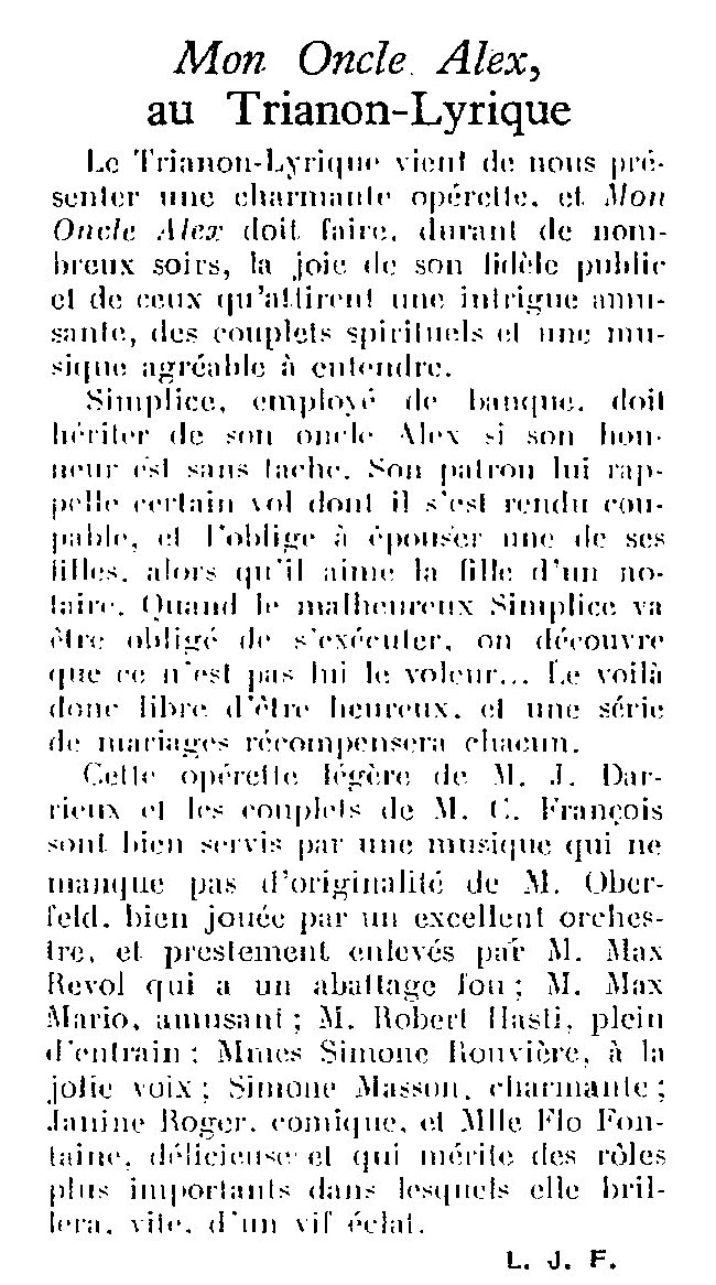 Simplice Radineau est venu de province faire un stage à la banque Orsel. Ce timide au grand cœur, perpétuel empoté, semble né pour servir la guigne. A l’envi se gaussent de lui les filles du patron, Denise et Alice, ses collègues Canelier et Bertin, et le trémoussant quatuor des dactylos-maison. Mais quelqu’un a juré de vaincre le guignon dans la destinée de Radineau : la Chance. Elle arrive du Midi, bruyante, redondante, sous les traits de la tante Clémence et de son notaire, maître Paterne. Un inattendu et mirobolant héritage, celui de l’oncle Alex, échoit à Simplice, pour peu que rien n’ait terni son honneur. Cher garçon ! En avant, toasts et champagne, dans le cabinet directorial ! C'est l’instant que choisit Orsel pour rappeler discrètement au trop joyeux Simplice certaine fâcheuse histoire : la disparition d’une liasse de billets, muée en reconnaissance de dette, et qui le met à sa merci. De cela, Orsel s’autorise pour s’installer a Cannes, dans la villa de l'oncle Alex, traquer Simplice et le contraindre à choisir entre Alice ou Denise. Notre nigaud ne serait point tant à plaindre s’il n’aimait Geneviève, la fille du notaire. Il l’aime même si fort qu’à la veille d’épouser Denise - préférée de guerre lasse et par hasard - il lui propose de l’enlever. Feinte heureuse, d'ailleurs, et qui laisse au coup de théâtre toute sa force de surprise. Un pourboire imprudent, un billet marqué, révèlent subitement l'auteur véritable du vol : c’est Canelier, indélicat par amour pour Denise. Pour avoir beaucoup aimé, d’avoir un peu volé lui sera pardonné.