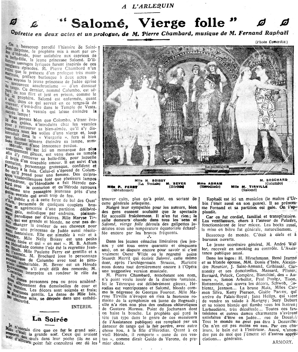 Nouvelle version en trois actes au Moulin Bleu, le 20 janvier 1925. La reprise de 1930 semble bien opportuniste, puisqu'elle eut lieu quelques jours après une série de représentations à Paris du "Salomé" de Richard Strauss, dirigées par le compositeur.