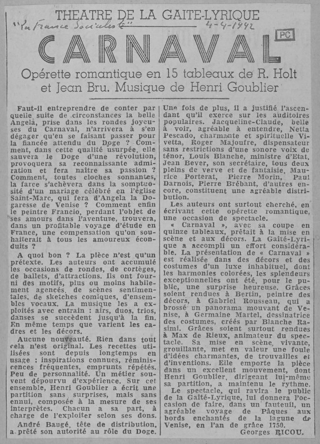 | Avec : Dachary (Lina), Collart (Claudine), Doniat (Aimé) - Dir. Cariven (Marcel) |