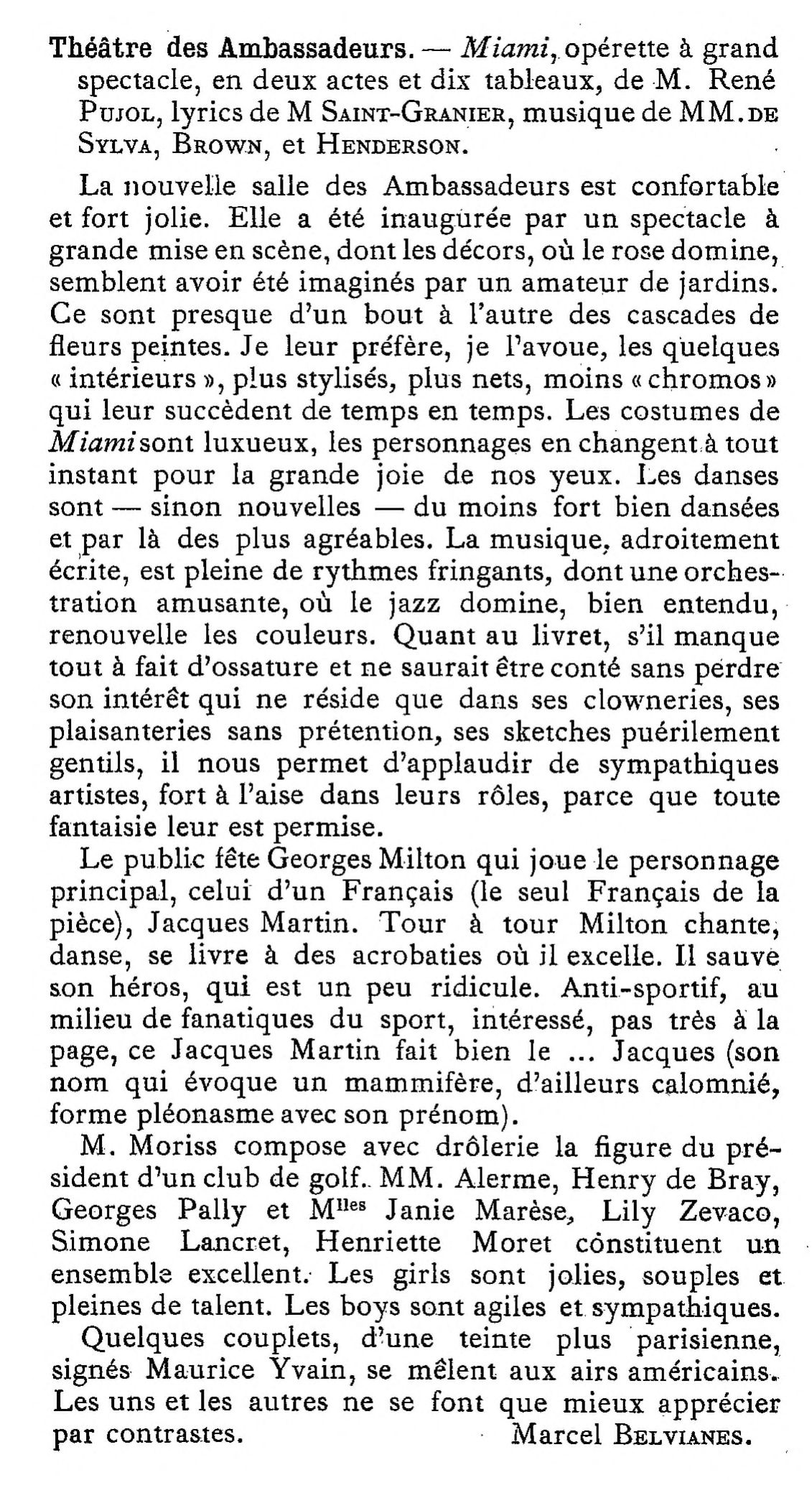 A Miami, la passion du golf mène tous les baigneurs. Le Golf-Club de Miami dispose d’un des plus beaux parcours qui soient au monde. Or, voici que survient un jeune Français, Jacques Martin, dont le père a spéculé très heureusement sur des terrains situés aux Etats-Unis - je rappelle que nous sommes en pleine opérette. Le golf de Miami lui appartient. Il entend le morceler et le lotir pour faire construire des gratte-ciel sur cet emplacement.