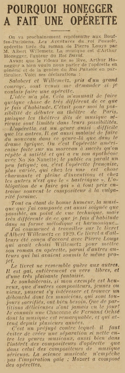 Reprise aux Bouffes Parisiens (mars 1937). Article par Georges Auric.