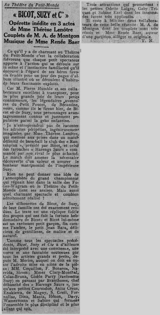 (Théâtre du Petit Monde, les jeudis en matinée) Suzy et Bicot étaient les héros de "Bicot", version française de la célébrissime série BD Winnie Winkle, créée par Martin Branner. La série a été publiée par Hachette de 1926 à 1939.