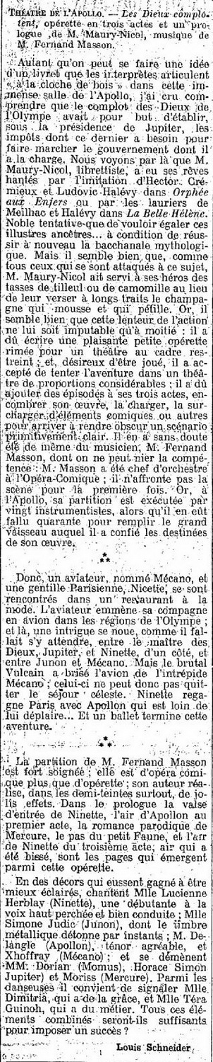 Un aviateur, dénommé Meccano et une étoile de rnusic-hall, Ninette, vont en avion, aparadiser en plein Olympe. Là, vous le devinez, Jupiter s’amourache de la petite mortelle et Junon s’éprend de l'aviateur, mais avec ce détail piquant que, le voyant barbouillé de cambouis, elle le prend pour un nègre qui, en rêve, la délecta vigoureusement. Cependant, Ninette préfère à tous les dieux le beau Paris, ravisseur d'Hélène ; Vulcain démolit l’avion grâce à quoi elle le veut enlever, et c’est Apollon qui, sur son char, ramène la terrienne étoile sur le sol de la grand’ville. Des réjouissances, présidées par Vénus, telle qu’elle sortit de l’onde, c’est-à-dire sans voiles, fêtent ce retour.